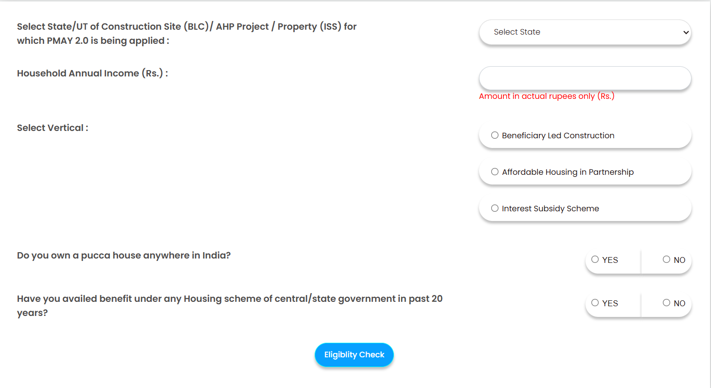 - अंत में आपको वेबसाइट के द्वारा योग्यता चेक करना पड़ेगा। जहां स्क्रीन पर अपना राज, घर बनाने के लिए कितना पैसा चाहिए, आपका पहले से पैसा घर है और पिछले 20 सालों में कहीं आप सरकार से इसका फायदा तो नहीं ले चुके हैं। इन सभी जानकारी को सिलेक्ट करने के बाद “Eligibility Check” बटन पर क्लिक करें।